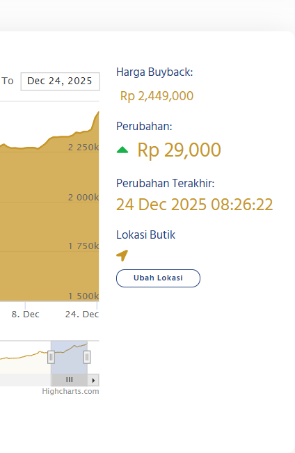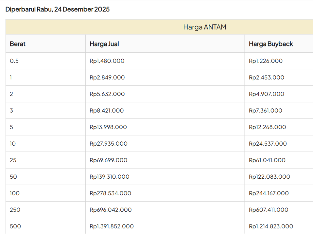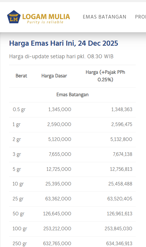 Berikut ini Update Harga Emas Logam Mulia Hari ini, Rabu 24 Desember 2025.