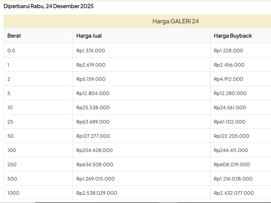 Update Harga Emas Logam Mulia GALERI 24 Hari ini, Rabu 24 Desember 2025.