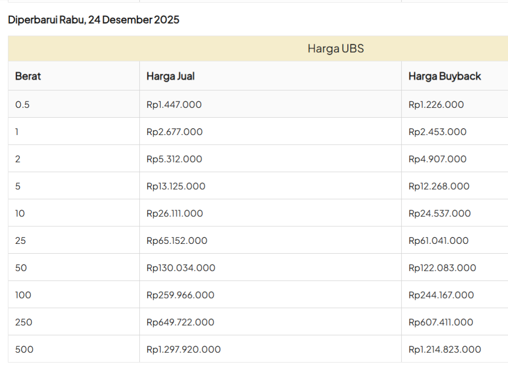 Update Harga Emas Logam Mulia UBS Hari ini, Rabu 24 Desember 2025.
