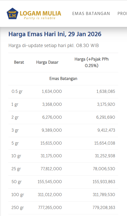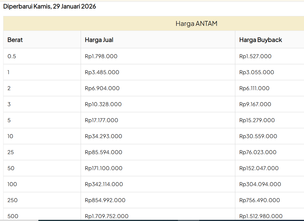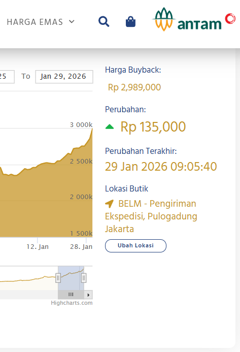 Update Harga Emas Logam Mulia ANTAM Hari ini, KAMIS, 29 JANUARI 2026.