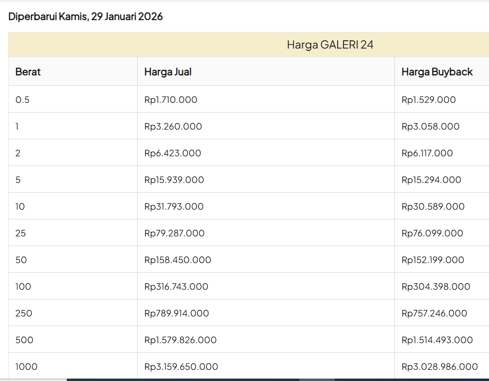 Update Harga Emas Logam Mulia GALERI 24 Hari ini, KAMIS, 29 JANUARI 2026.