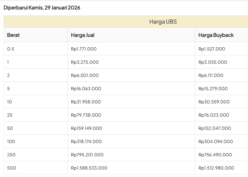 Update Harga Emas Logam Mulia UBS Hari ini, KAMIS, 29 JANUARI 2026.