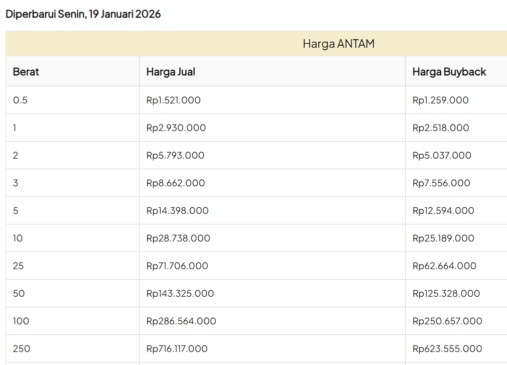 Update Harga Emas Logam Mulia ANTAM Hari ini, SENIN, 19 JANUARI 2026.
