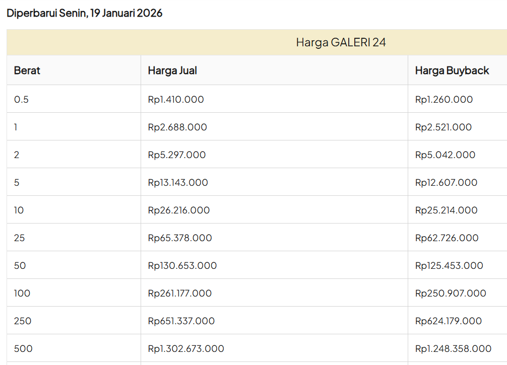Update Harga Emas Logam Mulia GALERI 24 Hari ini, SENIN, 19 JANUARI 2026.
