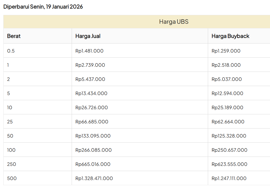 Update Harga Emas Logam Mulia UBS Hari ini, SENIN, 19 JANUARI 2026.