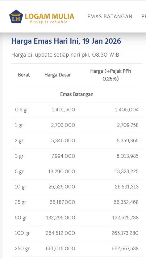 Berikut ini Update Harga Emas Logam Mulia Hari ini, SENIN, 19 JANUARI 2026 Turun Rp. 40.000,-