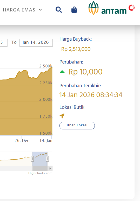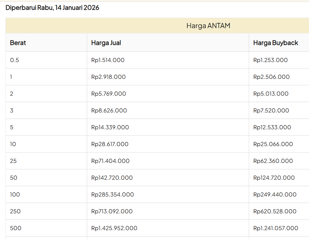 Update Harga Emas Logam Mulia ANTAM Hari ini, RABU 14 JANUARI 2026.