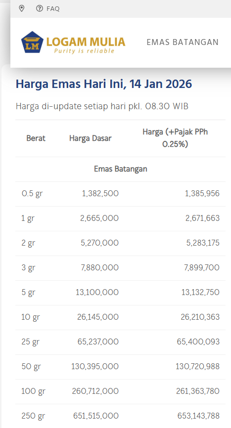 Berikut ini Update Harga Emas Logam Mulia Mulai Hari Senin s.d Hari ini, RABU 14 JANUARI 2026.