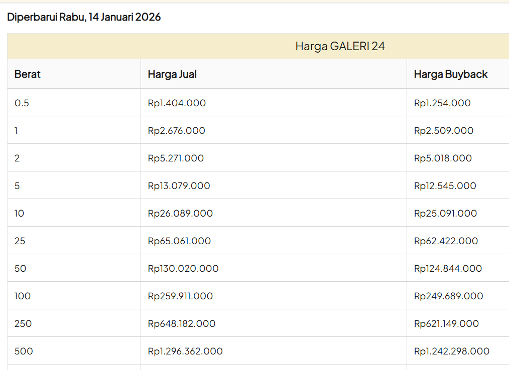 Update Harga Emas Logam Mulia GALERI 24 Hari ini, RABU 14 JANUARI 2026.
