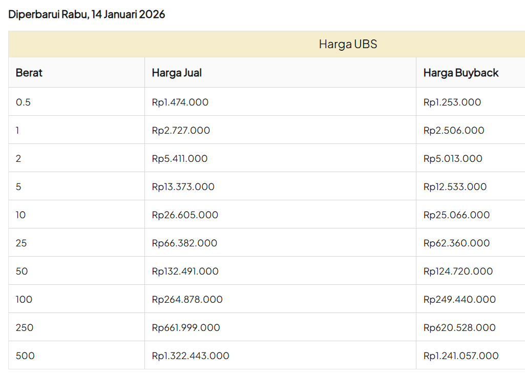 Update Harga Emas Logam Mulia UBS Hari ini, RABU 14 JANUARI 2026.